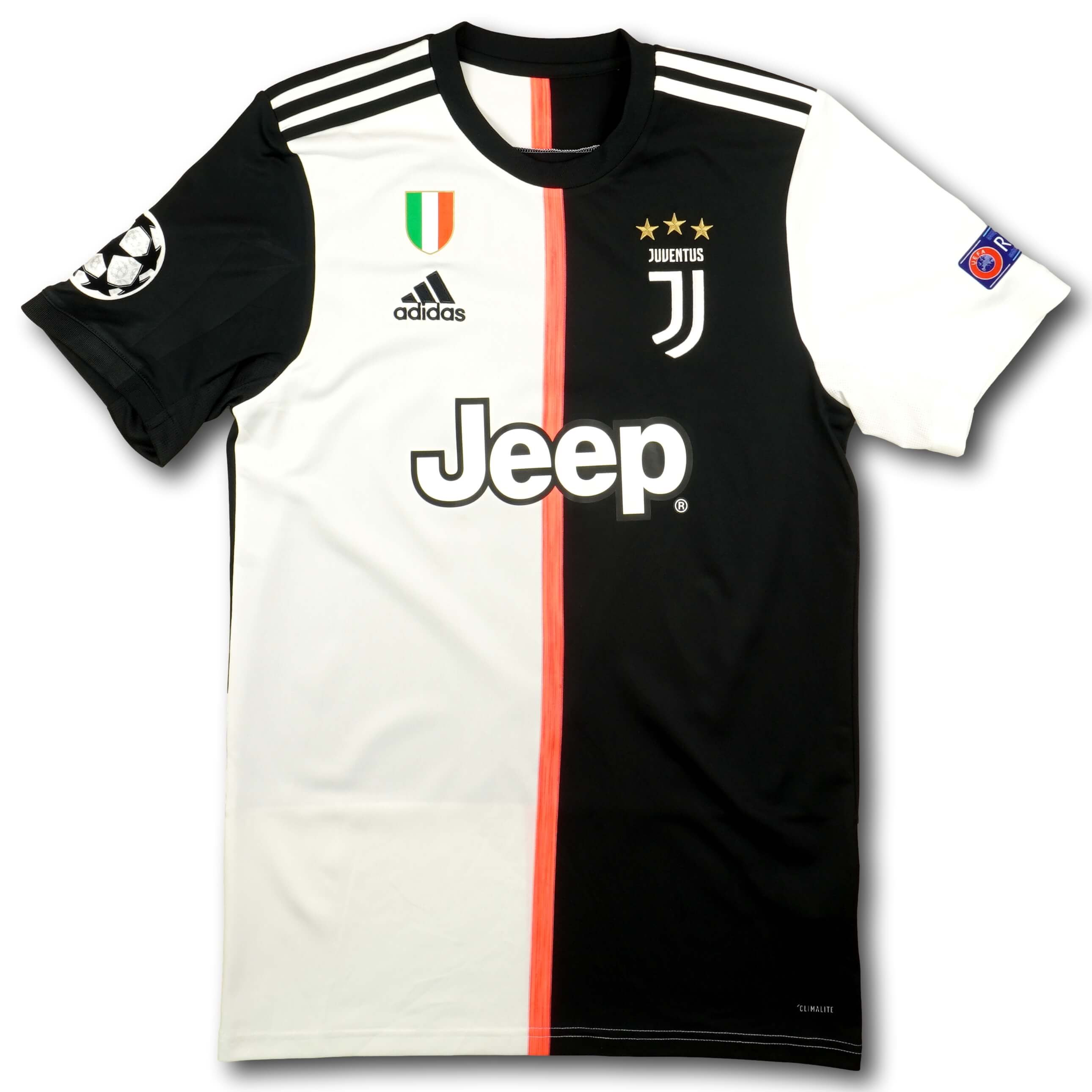 Juventus Heimtrikot aus der Meistersaison 2019-20 mit Nameset von Cristiano Ronaldo und Uefa Champions League Patches auf dem rechten und linken Ärmel. Das Trikot ist in hervorragendem Zustand.
