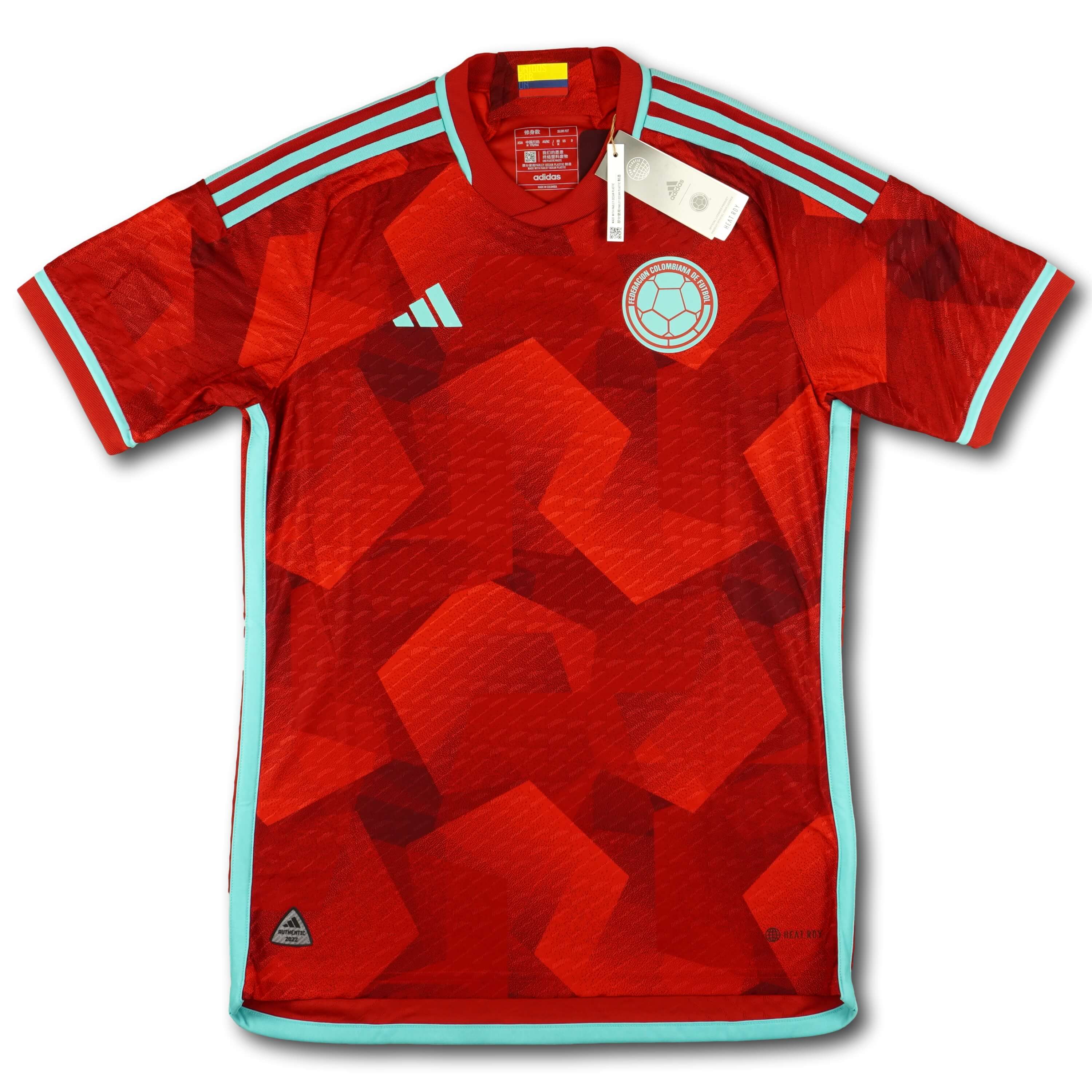 2022 Player Version Kolumbien Auswärtstrikot, ungetragen und brandneu mit Tags! Das Trikot wurde gemäss den Spezifikationen eines Spielertrikots hergestellt: Heat.Rdy Trikottechnologie anstatt Aeroready, schwarzes "2022 Authentic"-Adidaslogo unten rechts, mit Hitze aufgepresstes Herstellerlogo und Clubemblem sowie etwas leichteres und atmungsaktiveres Material.